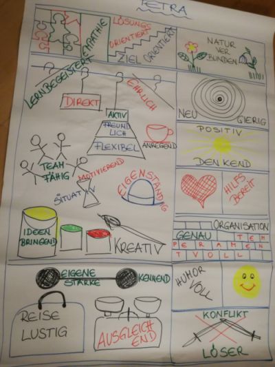 Hier zeige ich, was sich alles in meinem Ressourcenkleiderschrank befindet. Vielen Dank an meine Freunde. Als ich sie gebeten habe, das Bild anzusehen und eventuell mit positiven Eigenschaften von mir zu ergänzen, kamen lauter negative. Danke David, für das STUR – das ich eher als lösungsorientiert sehe. Danke Renate, ich weiß, dass nicht alle mit meiner sehr direkten Art zurechtkommen. Gott sei Dank für David und Renate, bin ich ein sehr humorvoller Mensch.
