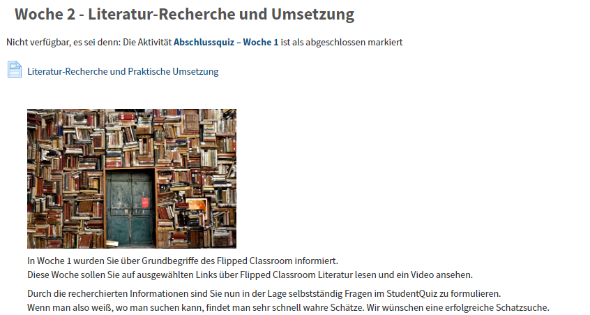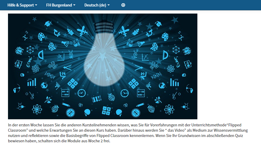 Das Ziel der Aufgabe war es ein Grobkonzept in der Fernlehre zu erstellen und dies dann in der Präsenzeinheit zu präsentieren. Nach dem Feedback unseres Tutors Robert Schrenk, arbeiteten wir die Inputs in unserem nächsten Treffen in das Feinkonzept ein und präsentierten unsere Ergebnisse wieder in der darauffolgenden Präsenzeinheit an der FH Burgenland. Mit dem Feedback unserer Studienkolleg/innen und unseres Tutors ging es danach zur Umsetzung auf der Plattform MOODLE. Mit der Präsentation im großen Hörsaal wurden dann alle erstellten MOODLE-Kurse in der letzten Einheit an der FH präsentiert.