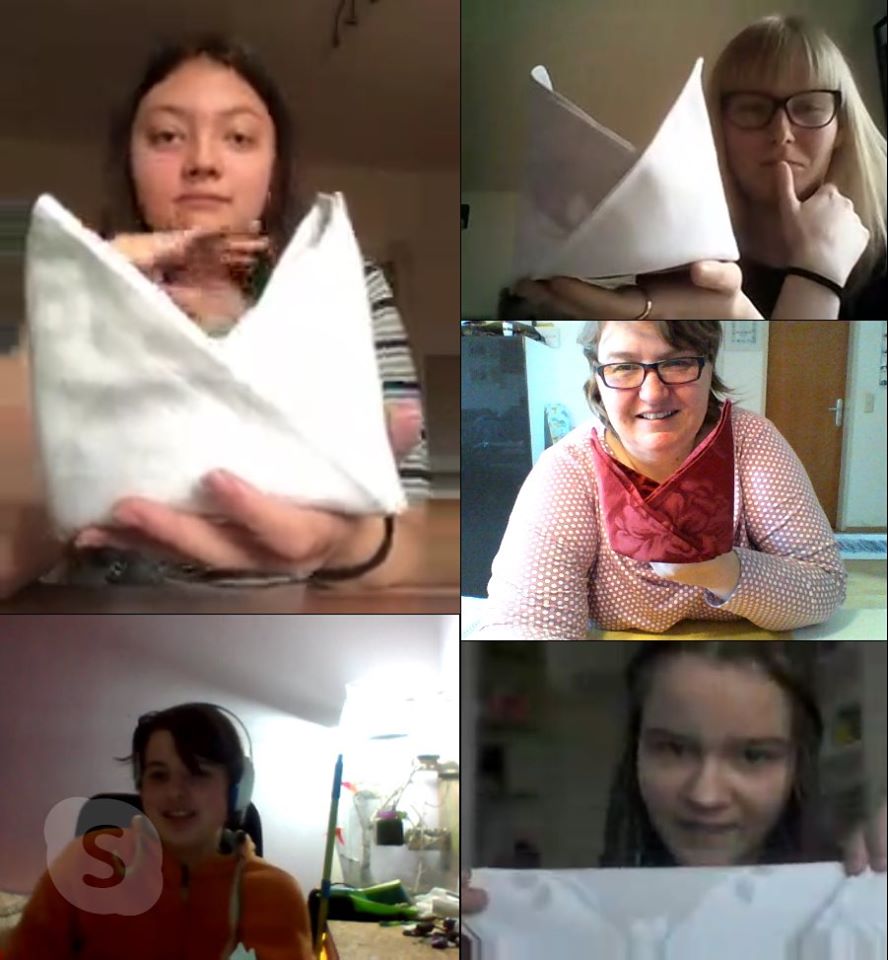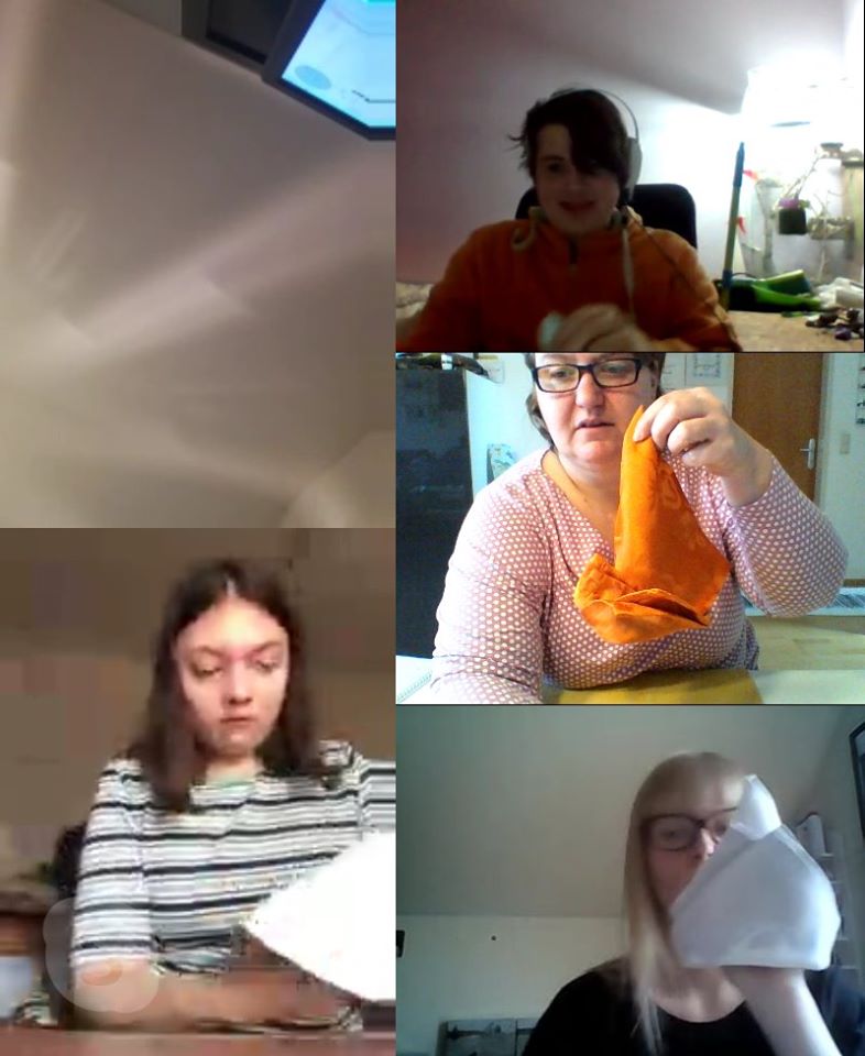 Die Farbe der Mundservietten bei den praktischen Übungen spielt eine große Rolle bei der Anleitung über den Bildschirm. Bei dieser Anleitung faltete ich die Servietten aus der Sicht der Schüler*innen, dies war eine Herausforderung für mich. Nicht alle Schüler*innen, die sich in der Schule gut organisieren können, können das auch von zu Hause aus.